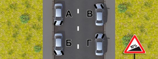 Если же колёса повернуть, как у автомобиля Б, машина может скатиться прямо на дорогу. А если колёса повернуть, как у автомобиля Г, машина сначала покатится на дорогу, а потом задние колёса упрутся в бордюр, из-за чего машина встанет боком и будет мешать движению.